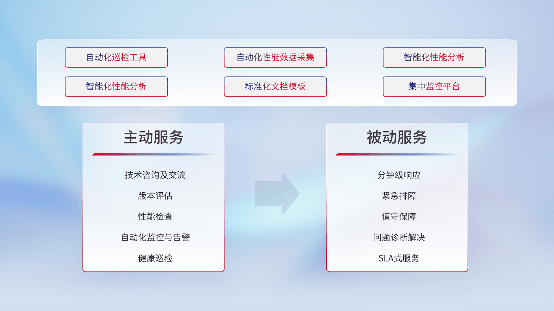 智能化工具和标准化文档,,,保障服务质量,,,提供主动服务(包含技术咨询、、、、版本评估、、性能检查、、、、自动化监控与告警、、、健康巡检)和被动服务包含(分钟级响应、、、、紧急排障、、值守保障、、、问题诊断解决、、、SLA服务)。。。。