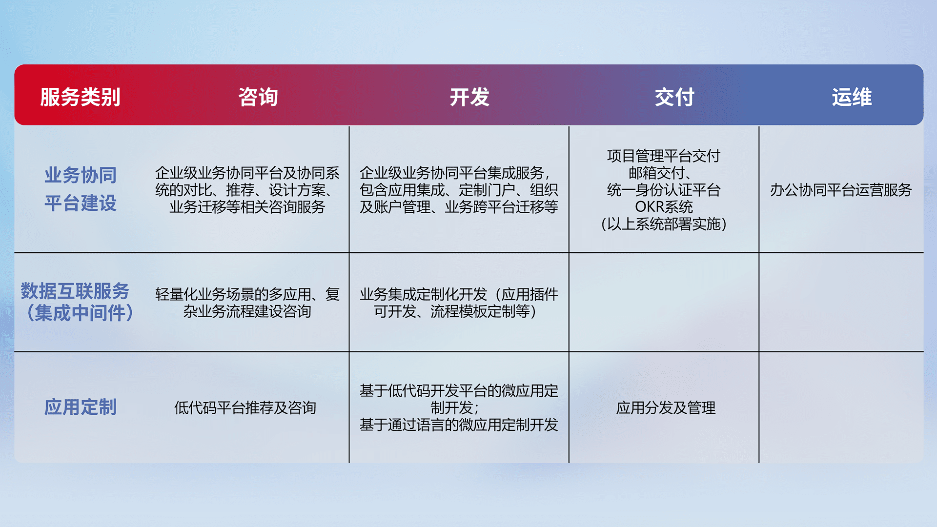 针对钉钉、、企微、、、、IDaas等平台级产品提供产品的规划、、、、方案、、、交付、、、、定制化开发等服务,,,,实现如统一协同办公、、智能客户服务、、、混合会议管理、、、智能数据查询、、、、等业务场景,,,,实现数字化转型。。。